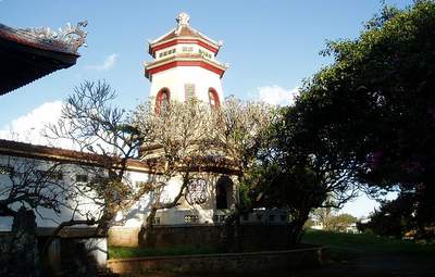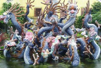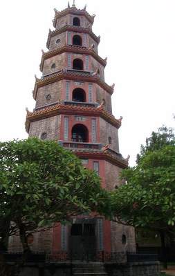 Hue (pronounced 'Hwey') is a pleasant river town full of history, tourists, and motorbike/cyclo taxis. It's also a dieter's hell, as some years back it was home to a guy who demanded every night that 50 dishes be prepared by 50 cooks, and as a result, the streets are teeming with tasty snacks that cost around a nickel a piece. On my first day there, I wandered around a dozen different pagodas, went to the war museum (which was ever-so-slightly biased against us), and went to the imperial palace, which may have merited its 55,000 dong admission price at one time in its history, but (thanks to those pesky Americans) was now mostly just one big pile of rubble. For dinner I went to a restaurant run by a deaf guy, which was flanked by two other restaurants run by deaf guys (it leads you to wonder just how many deaf restauranteers one neighborhood can have); using only sign language (actually, nothing's really new there) I ordered "roll-your-own" spring rolls which were essentially the oriental equivalent of fajitas; my spring rolls never looked even remotely like what you'd order at a restaurant and usually had to be eaten with a spoon, but they were tasty nonetheless.