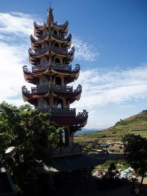 I started out heading east in search of Tiger Falls (thus named because someone stuck a big concrete tiger there) but somehow missed that and instead came to a really impressive pagoda that didn't seem to be mentioned anywhere. Next, I arrived in D'ran which had some hilltop temples of one sort or another; while I was photographing one of these, a local English teacher, who may or may not have been completely nuts, came and emphatically greeted me and invited me into his home; he informed me that there was absolutely nothing of interest in this neck of the woods and I was obviously very lost.