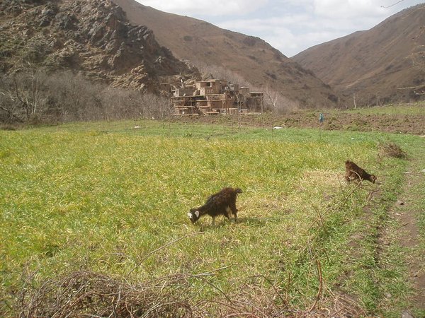 Rather than take the road back, I followed a series of goat paths that led in no particular direction, and I eventually found myself lost in someone's backyard. A family took note of me, and the mother sent her two young boys down to show me the way out and invite me in for tea. I was quite touched, as the gift of tea is the quintessential Berber sign of welcoming and friendship, so I accepted and was led into their humble adobe house. The boys turned on the cartoon channel for me to watch (like most houses in the area, a satellite dish was perched atop the thatch roof) and soon brought out a kettle along with some bread, butter, and olive oil. After a delightful meal where we discussed such things as our respective ages and names, which was about the limit that our French would allow, I thanked them profusely and took out a bag of apricots to give to them (dried apricots are comparatively very expensive and I assumed they must be highly prized). However, at this point the mother showed up and swatted the apricots away, demanding that I pay them cash instead. I stood there for a moment, deeply lamenting not having a better French or Temerit vocabulary with which to teach the boys a thing or two about the principles of hospitality that their mother obviously had never imparted on them, then I pulled a "Look, what's that over there!" and darted past the itinerant mother and fled the village. All the while, the mother stood there shouting after me, while her neighbor laughed hysterically.