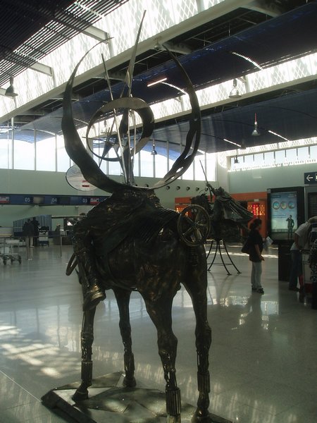 I knew my buying power would soon be significantly reduced, so I sought out a substantial breakfast of oatmeal (with olive oil), yogurt, and a giant slice of chocolate cake - all of this added up to around 80 cents. Lacking the energy to find a cheaper way to the airport, I once again boarded the $4 train. On the way, I was befriended by a suspicious character from Cote d'Ivoire who was in Morocco to "do business" and was flying home without any luggage; he lost interest in me after I declined to give him my phone number, so I never figured out what his game was. The Casablanca airport has just a smidgen more amenities than a typical Moroccan bus station, but is short on chairs, water fountains, and toilet paper. After a four hour wait, the plane ride was only a tad over an hour, and I reached Madrid Barajas by 5.