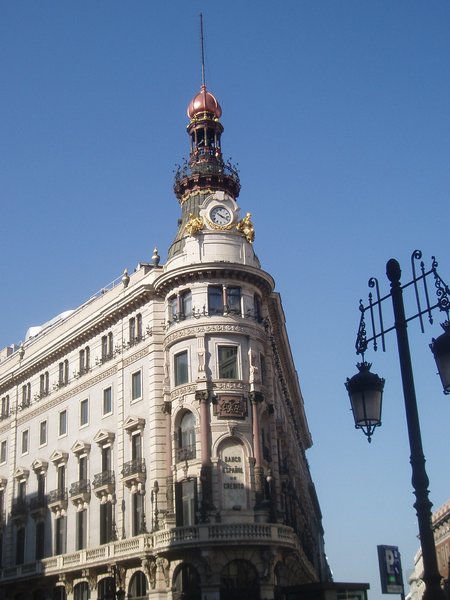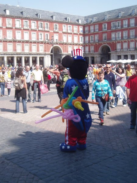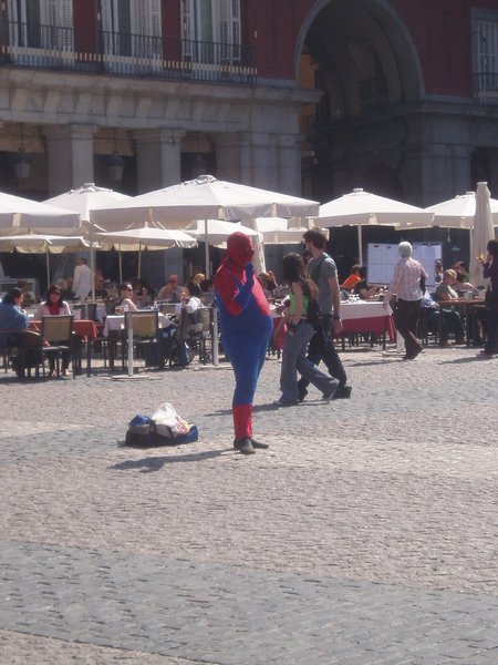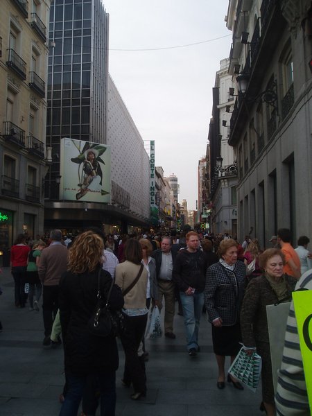 Madrid gets serious kudos because it is one of the few cities in the world that doesn't gouge passengers on transport to and from the airport. You can board the subway or a bus straight from the terminal and go anywhere in the city for a single euro. After three quick train switches, I emerged in Plaza de Callao. Here, there was a protest in progress (against what, I'm not sure, but they had a great drum line) and further down the pedestrian walks radiating from the plaza were human statues, balloon artists dressed as Disney characters, and immigrants selling bootleg DVDs.
