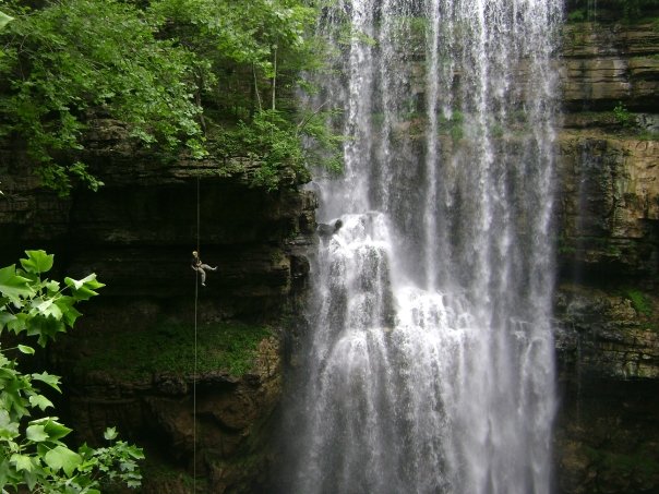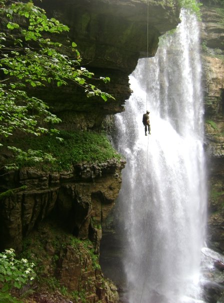 All this being said, Virgin Falls Pocket Wilderness is a great place to take those new to the sport. It's impossible to walk the 10-mile trail without seeing at least half a dozen gaping entrances, and there are a slew of places to do some epic vertical work with a convenient fireman's belay. I've already covered the place in the southeast roadtrip post, but this time we had Phillip, ropes expert and crazy climber extraordinaire, to set up a rappel off of the lip of the waterfall-fronted cavern where we had camped the night before (refreshingly misty in the summertime, quite cold in the winter), and another down the side of the 120-foot Virgin Falls.