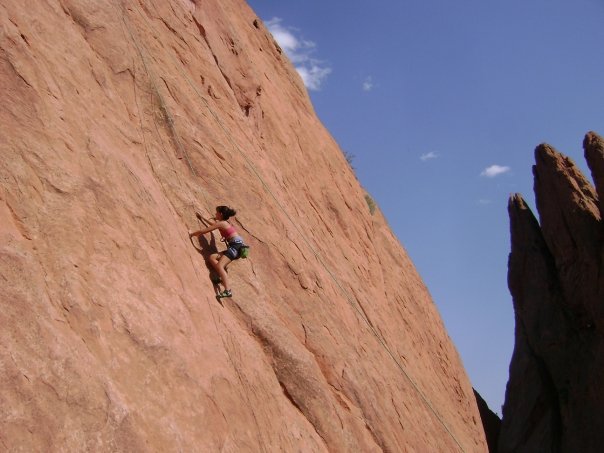 I woke up and drove us to Garden of the Gods at dawn; we were one of the first cars in the lot, and Scott and I got an hour of hiking in on the park's empty trails while the others slept. I spotted no fewer than twenty rabbits hopping around the towering rock formations, as well as deer, chipmunks, and other assorted critters. We biked around the park's scenic, rolling one-way roads and along several challenging MTB trails. The main attraction of the place was the excellent assortment of sport and top-roping routes that ran up the faces of the walls and spires, so after procuring a climbing permit, we set about rigging our rope. The first one we chose was over my head, and after a few hours of trying to lead it (leading = really scary version of climbing necessary for setting up a sport route - you can fall quite far if you pick the wrong time), we convinced a passing expert to set up our rope for us. We spent the remainder of the evening climbing the two spires at the center of the tourist track, which were encircled by a sidewalk and saw several hundred passers-by an hour. Climbing these was a bit like being one of the monkeys on Monkey Island at the zoo; visitors gathered around and pointed and marveled at the mysterious creatures that effortlessly scrambled up the pinnacles; children made funny faces at us to try to elicit some response.