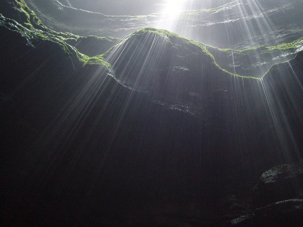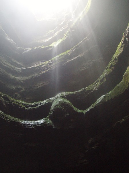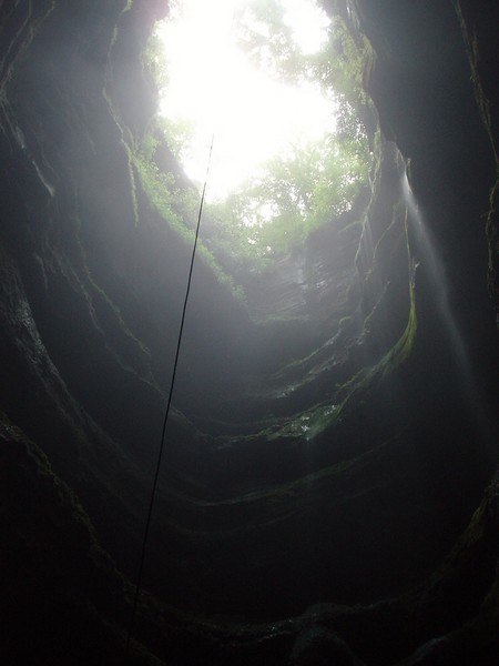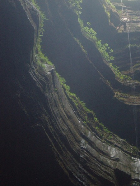 Piet rappelling down into pit