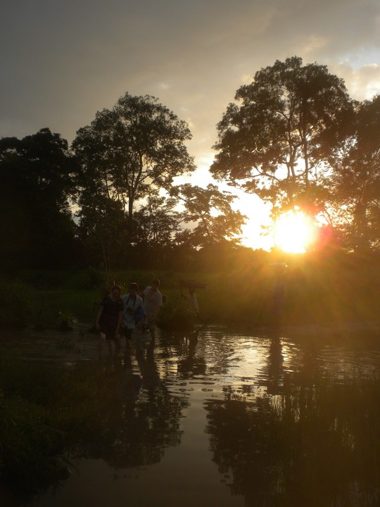 Notice the locals walking straight through as we awkwardly try to cross on the reed bridges