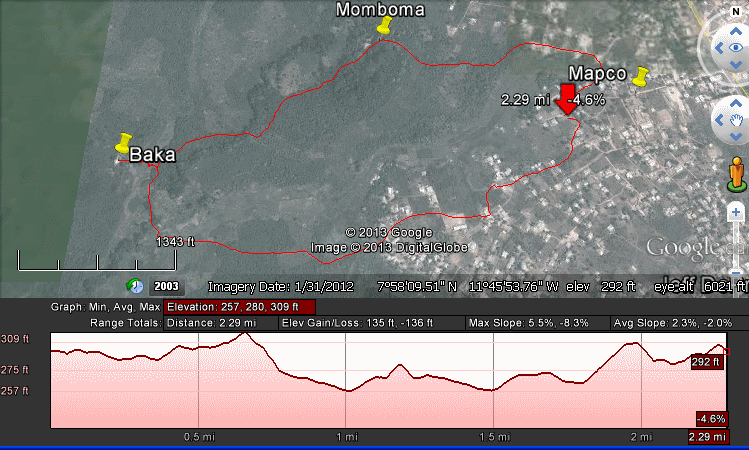 Obama gave us the Krio assignment of going to a tailor shop and getting the names of twenty different styles. The tailor we found was able to name two. I led an after school bush walk towards the village of Baka, but by the time I had actually assembled everyone, we had less than an hour of daylight and were forced to stop short. While I was out, Daryn stopped by to talk to my family about my progress brooking, cooking, and speaking Krio.