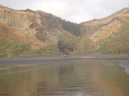 The west coast beaches were covered in black sand and the water temps were right around 15C, which, if you perform the standard conversion, you'll see is equivalent to the Fahrenheit reading of "really freakin' cold!!" The kiwis dove in but I was content to dip a foot and then go for a walk on the beach. There were a number of teenagers doing donuts on the sand, but in between dodging their speeding cars, I was able to admire the amazing cliffs that lined the shore and the fleet of hangliders and parachuters that filled the air.