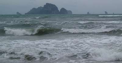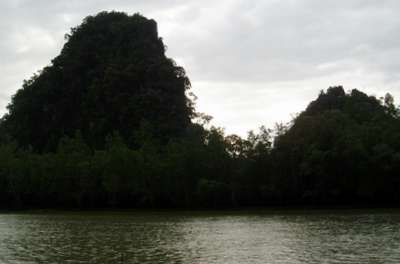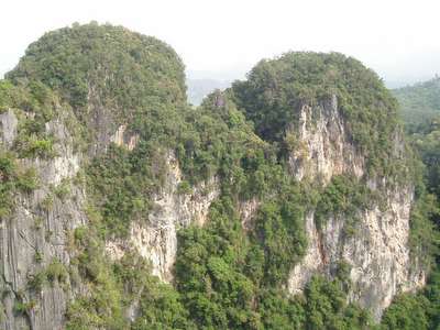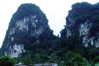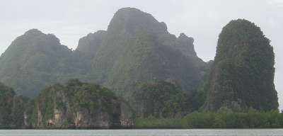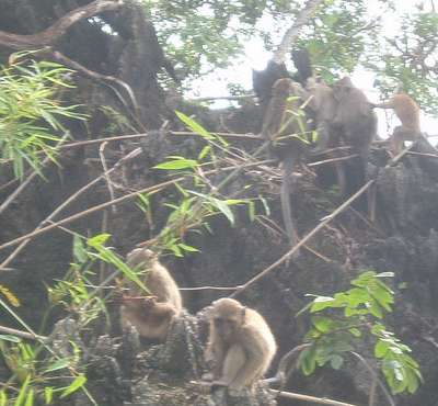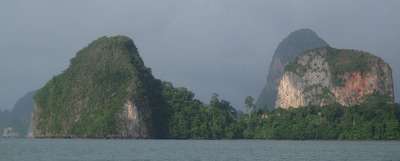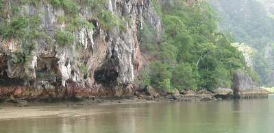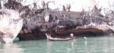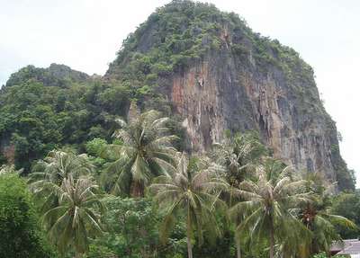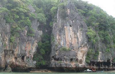 Returning to town I took a boat from Ao Nang Beach out to a group of beaches that were world-famous for their rock climbing. The boat went straight out through the 2-m surf and was adeptly steered over each peak; though as one particularly huge wave crested right before our bow, our fate became clear and all my possessions were instantly soaking wet. We surfed into shore and just barely made it without tipping. There were a number of shops offering half-day rock-climbing trips but slogans such as “all instruction provided" and “fun for all ages from 5-105" deterred me, and I was content to just march through the formations of Diamond Cave and hike through the construction zones of the surrounding beaches. I returned via the “all-weather route" to the other side of the peninsula and grabbed a songtaew back to my bike.