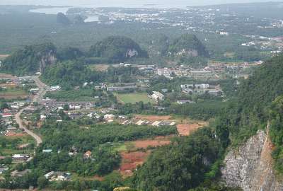 In the morning, I took a nearly empty, constantly twisting road through the mountains back in the direction of Krabi. On the way into town I visited the Tiger Cave Temple that sat several thousand feet above the surrounding landscape on an abrupt chunk of rock. Unlike in Kanchanaburi, they didn't have live tigers for guests to play with (it would've probably been quite a trick to get them up the 900-step staircase), but there were plenty of belligerent monkeys that would sit in the dead center of a step and force me to swing up the banisters to the upper levels. As could be expected, the views from the top were pretty incredible, and after I had regained consciousness following the ascent, I was inclined to stare out over the surrounding landscape and hold off on the return trip as long as possible.