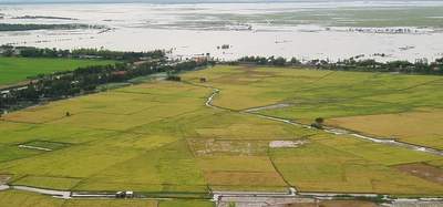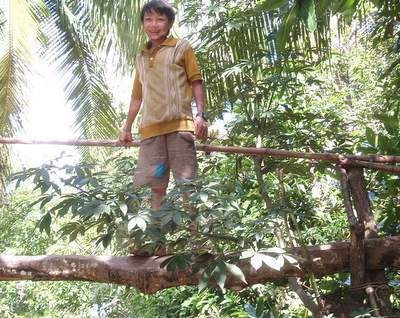 One brochure had claimed that we would sail into sunset towards Cantho; it's debatable whether there was actually a navagable passage between the two cities, but at any rate, we ended up spending a few more hours in the bus. At Cantho, the two Montana girls and I were loaded on to a cyclo (motorcycle with tiny cart attached) and carried to the edge of town; here, three motorcycles took us out to the country to our homestay. Two German guys had arrived before us; they were both deaf, but were experts at reading and writing English, and were far more adept at communicating with the Vietnamese through signs and pictures than we could ever hope to be. The family prepared us a feast and tried their best to show us how to correctly eat it as we all sat in a circle on the empty wooden floor of the living room. The meal was accompanied by a 2-liter bottle of rice schnapps (100 proof), and someone among the family would spontaneously decide that we should all take shots about once every 5 minutes.