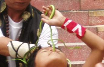 In the morning, I headed to the zoo; the exhibits in themselves were rather pitiful, but I did get to see three zoo attendants collectively wrestle a giant goanna that had snuck into the deer habitat. As usual, the park was geared towards younger audiences, so I was a bit surprised to see that they put on a daily self-mutilation show. When I first arrived and saw a fat man rubbing a burning torch all over his body, I assumed it was a cheap carnival trick, but this was followed by a guy who stuck nails through his shoulders and nipples, another who hung steel ball from hooks in his tongue, and about 10 variations of the standard sword-swallowing trick (the grand finale being a giant pair of serated scissors that were opened inside his chest); the most intriguing act was a boy who threaded a snake from each nostril to his mouth and then proceeded to yank them back and forth. This was immediately followed by a performance by two men dressed as cats who played with hoola-hoops and held a sack race.