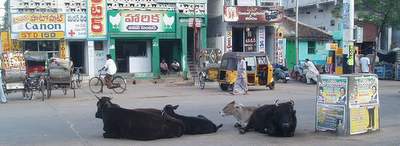 At another temple, large monkeys climbed up the framework; I made the mistake of looking one of these in the eye and he promptly jumped down and chased me off the premises. Cows roam the streets throughout town; they seem a tad bewildered by their lot in life - they just stand around, eat garbage, and occasionally get smacked by angry shopkeepers and motorists - they seem to like markets the best as there are plenty of fruits and vegetables just lying around on the street. Old women go around collecting cow pies (with their bare hands); they mold them into discs and leave them to drive in the sun - I'm not really clear on what happens to them after this - probably sold as some sort of souvenir or snackfood to unsuspecting westerners (update: I'm told these are used to fuel biodiesel-powered rickshaws).