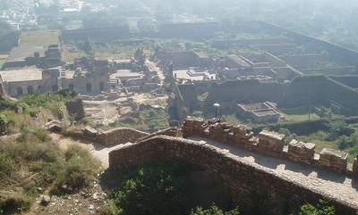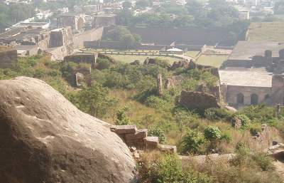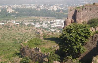 In the morning I spent an hour sorting out the bus situation and eventually found one that went to Golconda Fort. This was a very impressive, ancient structure where you were free to scramble around on the ramparts and gaze over the city from the heights of the central towers. Next, I took another 4 or 5 buses to get over to the fever hospital where I they put a big "Nagative" stamp on my file for Malaria. From there I went to a hilltop temple where they confiscated your camera so you couldn't get any shots of the surrounding city.