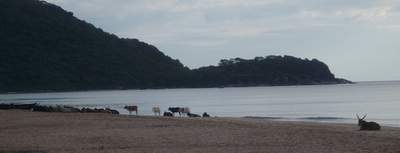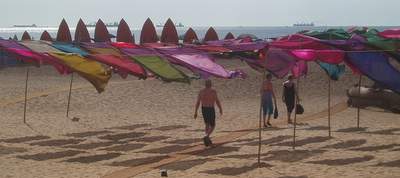 We got a general ticket on the next train two hours later. At the appointed time, a train pulled up to the station; we couldn't find a general compartment, so we jumped into an AC sleeper. Shortly after the train pulled away, a fellow passenger informed us that we had in fact boarded the wrong train and that we would no doubt be fined heavily. Since this was an express, it would likely not stop til well after our intended destination, so all there was to do was sit down and enjoy the ride. A waiter came by and offered to bring us a few extra breakfast omellettes provided we gave him a tip; this sounded like a great deal until he rejected our first tip (a very generous 50 rupees) and would accept no less than double that (the implication clearly was that this was hush money for not running to the ticket collector). The train stopped earlier than we expected, so we jumped off at the town of Karwar without the slightest inkling what the place was about; for some reason of which I'm not really aware, we decided to forget about the train that would be arriving shortly and take a taxi to the bus stand where we caught a ride to Canacona. When we reached that station, the girls decided that they would find a taxi to Palolem; I opted to hop on one of the buses that left every 10 seconds and never saw them again.