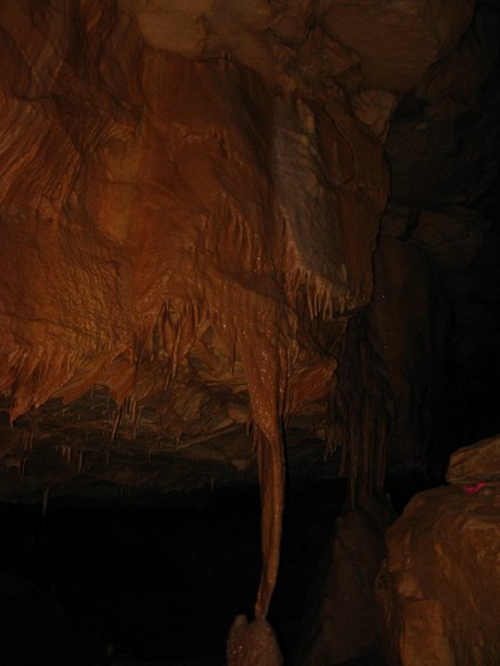 Whorley's Cave is a mile down a residential street in a tiny town in the far northeastern corner of Tennessee. We deposited $10 in the owner's mailbox to cover our admission fees and prepared to go searching through the brush, but he showed up just in time to give us a map and explain how to find the cave. It was not hard to find the mighty river that flowed out of the cliffside, and right next to this lay two massive, blowing entrances. The gate on the main entrance was well-aged, and after pushing and pulling for some time with no luck, we conjectured that it might be rusted shut; it eventually opened, though, and we closed it behind us, hoping that it could be convinced to open again in a few hours' time. Nearly the entire cave was huge walking passage, and there was little in the way of climbing or crawling. Despite its high frequency of use, many of the cave's giant formations were relatively undamaged, which made it a worthwhile, though somewhat easy, trip. We eventually got lost and returned to the entrance within 3 hours of our start.