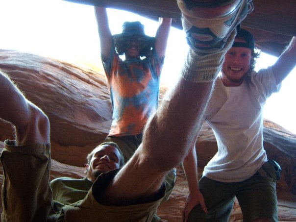 Scott and I rolled into Moab with a few drops of gas to spare; the Sentra turned out to have about half the range of the Corolla, and so we found ourselves repeating this scenario again and again in the remotest reaches of the southwestern deserts. We dropped by the visitors' center to inquire about bike trails, climbing shops, restaurants, and free camping; the lady at the desk, without any prompting, also shared with us a few not-so-subtle hints on where we might find a cheap shower. We got an $8 primitive campsite right next to the famed Slickrock bike trail and watched the sun set over the rolling sandstone as we waited for our friends to arrive. While we waited, a family of unicyclists attempted to ride the trail, which is considered a formidable challenge even for experienced mountain bikers, and didn't seem to be making it anywhere very fast; this seemed like one of the more sadistic family activities a dad could subject his kids to. Van had inconveniently called us just moments before her phone died, and so we spent a few tense hours trying to contact her and Andrew via phone, walkie talkies, and smoke signals, but they fortunately showed up with an hour to spare til the panic time.