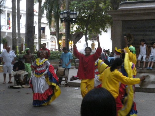 As much as we wanted to see what the fans would do once their team won or lost, we decided it was probably in our best interest to get far away before the end. It took no small amount of negotiation to get the guys' belts returned to them, but we eventually recovered them and boarded the first bus back to the center. At the naked indian statue, a large xylophone-rich parade was under way. We sat and watched this for a while, then went to find dinner. We ate at another restaurant just outside our hostel; since a few in our group had little more than the bus fare back, some balked at the 7000 peso menu price. The owner beneficently lowered the price to 6000 and comped Justin, who only had 1500 pesos to his name, a full bowl of soup, rice and plantains. Before we left, Justin made sure to extend a bear hug to the owner to express his gratitude.