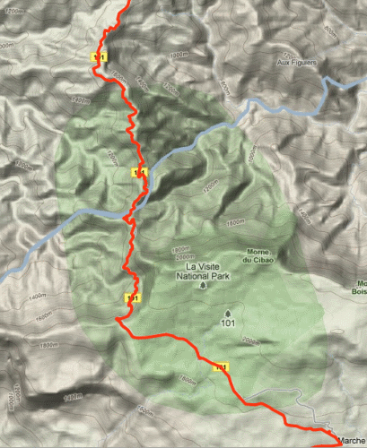 5. Seguin to Depot (Marigot) - 10 miles. This is actually the main road that connects the coast to the mountains; you can occasionally find a truck that plies the route, but usually you have to pay top dollar for a motorcycle taxi. It is much easier to walk south than north. There are many shortcuts and alternative trails that can be spotted from above and make for a fun break from the monotony of the road. From Depot, there are regular buses to Jacmel which cost about 50 gourdes.