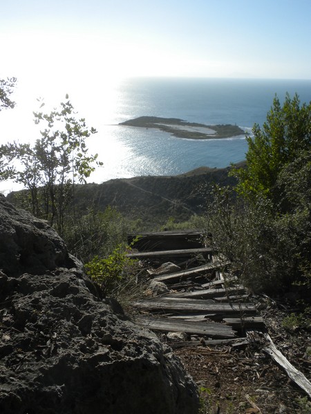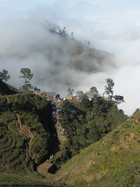 A little ways up the trail, the path was partially blocked by a large boulder which had fallen from the cliff above, and a couple of men stood atop it, hammering away with pickaxes. The trail followed a jagged series of peaks, dipping in and out of the clouds and providing some of the more spectacular views I've seen on a hike. At one point, the path flattened out and became a road on which motos could be driven and the pedestrian traffic dropped to a trickle. It soon entered a deep, dark pine forest, a true rarity in this country, and provided a very cool, peaceful walk into Seguin.