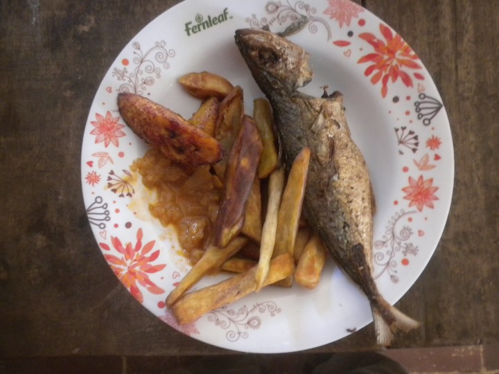 Weekly fried food day with french fries, fried fish, fried plantains, ketchup and mayo