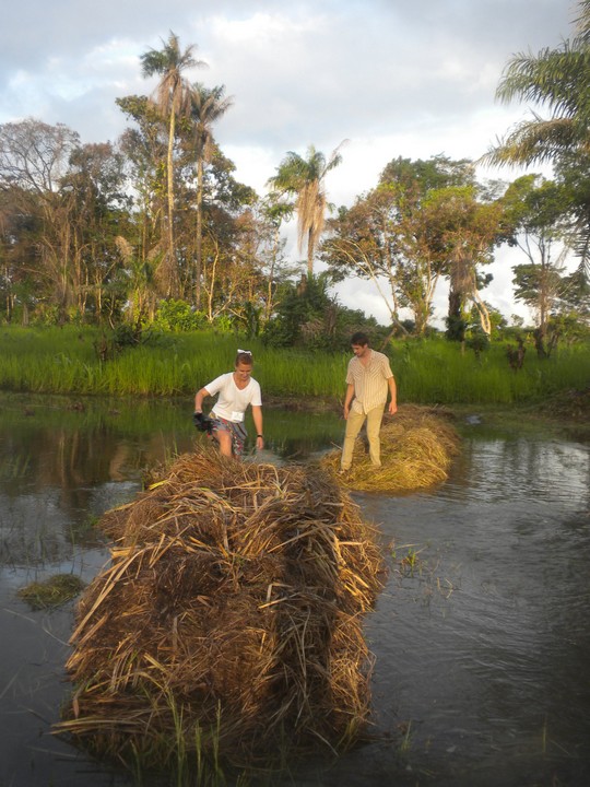Notice the locals walking straight through as we awkwardly try to cross on the reed bridges