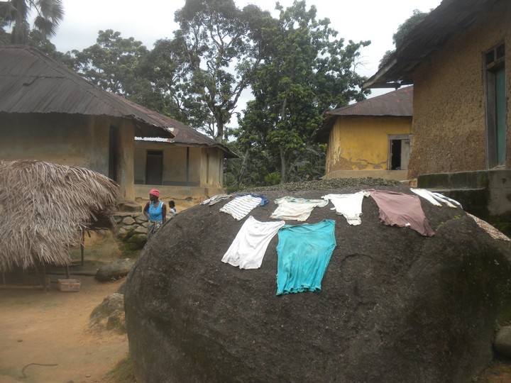 The average walking pace of a Sierra Leoneon is ludicrously slow, but Bob and his friend were actually very speedy hikers, and they were quite skilled at instantly choosing the right path at an unmarked fork. The trail took us through the rice paddies, and up and over a big rock, then continued through dense jungle to multiple small villages – each had an intricately woven vine gate at its entrance. We arrived at one woman's hut just in time for lunch, and she shared with us her family's bowl of boiled bananas and palm oil.